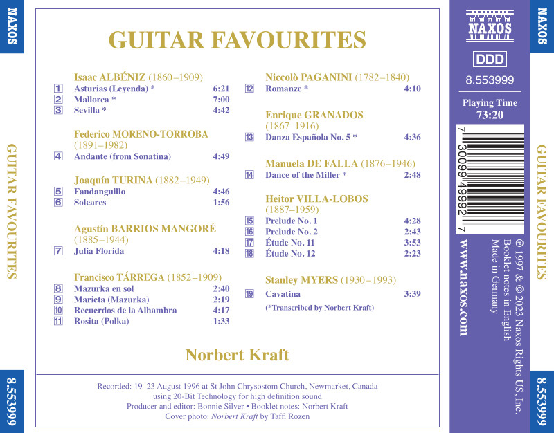 Norbert Kraft performs works by the composers Isaac Albéniz, Federico Moreno Torroba, Joaquín Turina, Agustín Barrios Mangoré, Francisco Tárrega, Niccolò Paganini, Enrique Granados, Manuel de Falla, Heitor Villa-Lobos, and Stanley Myers.