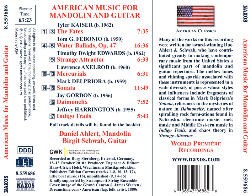 Contiene obras para mandolina y guitarra de compositores americanos del siglo XX: Tyler Kaiser, Tom G. Febonio, Timoty Dwight Edwards, Lawrence Axelrod, Mark Delpriora, Jay Gordon y Jeffrey Harrington.
