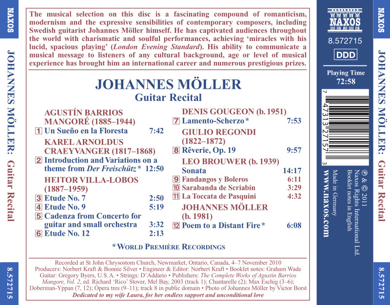 Johannes Möller, ganador de la 2010 Guitar Foundation of America Competition, interpreta una selección de obras de los compositores Agustín Barrios Mangoré, Karel Arnoldus Craeyvanger, Heitor Villa-Lobos, Denis Gougeon, Giulio Redondi, Leo Brouwer, y una pieza de autoría propia.
