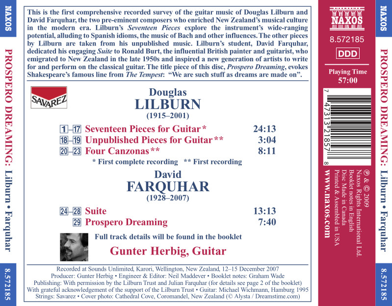 Este disco rinde homenaje a dos compositores neozelandeses del siglo XX, Douglas Lilburn y su alumno David Farquhar. Del primero se incluyen varias piezas de guitarra nunca antes publicadas totalmente, y del segundo su conocida Suite, y la pieza Prospero Dreaming que da título al disco.