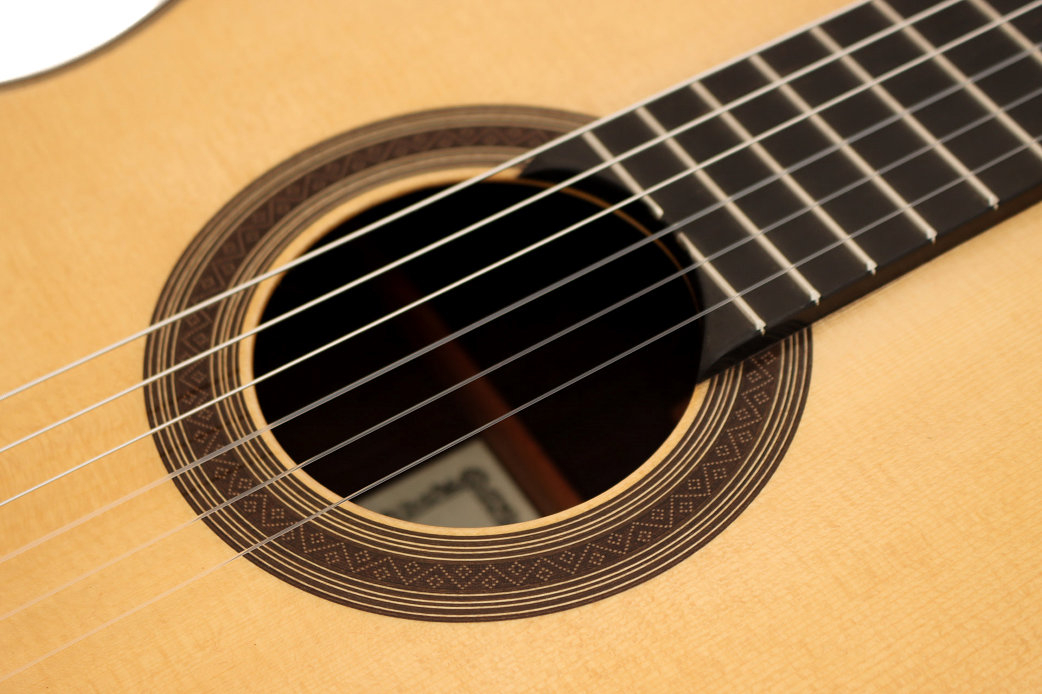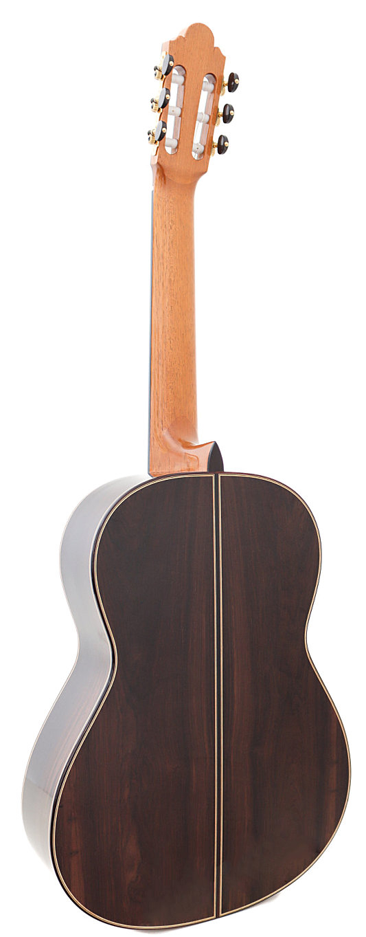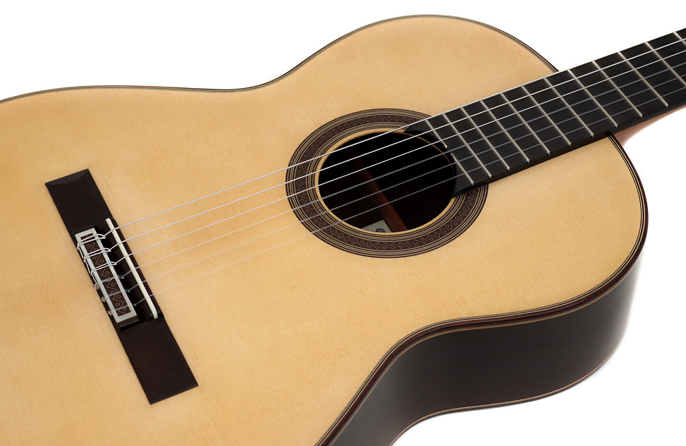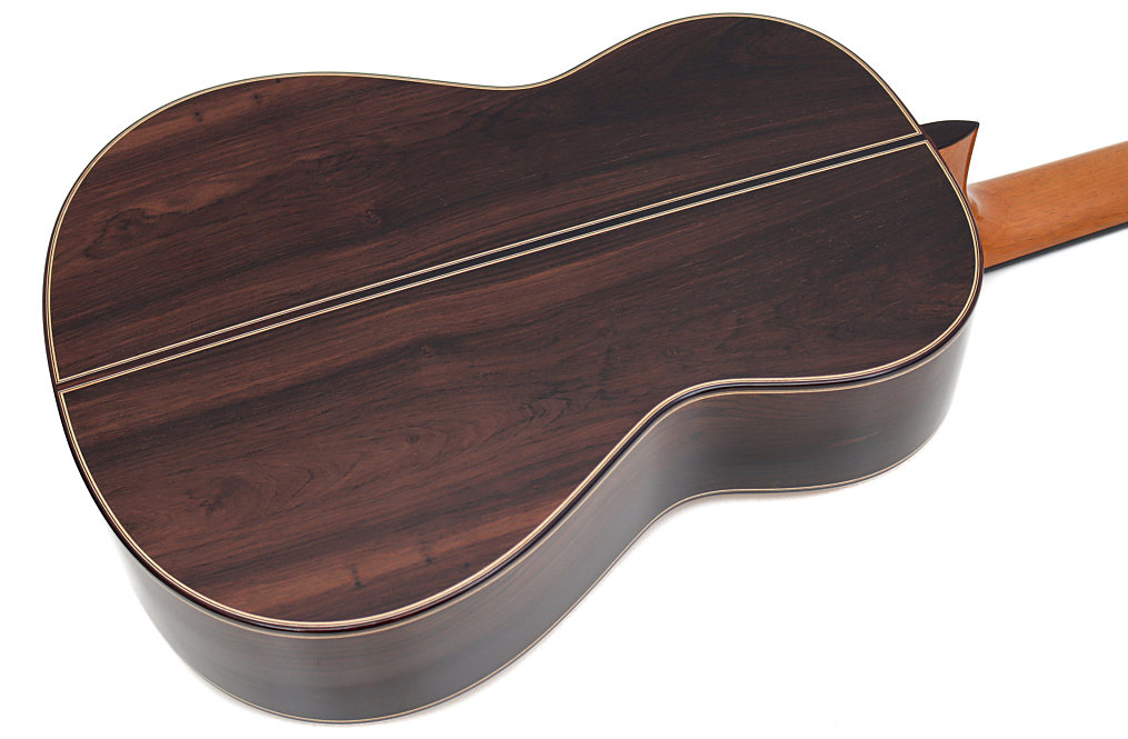 In particular, this guitar made of German spruce top of exceptional quality, combined with the back and sides made of an exotic Brazilian rosewood (Amazon rosewood, it doesn't require CITES), offers a sweet and sensual sound, of great beauty and color, with a long sustain and a magnetic and seductive tone.