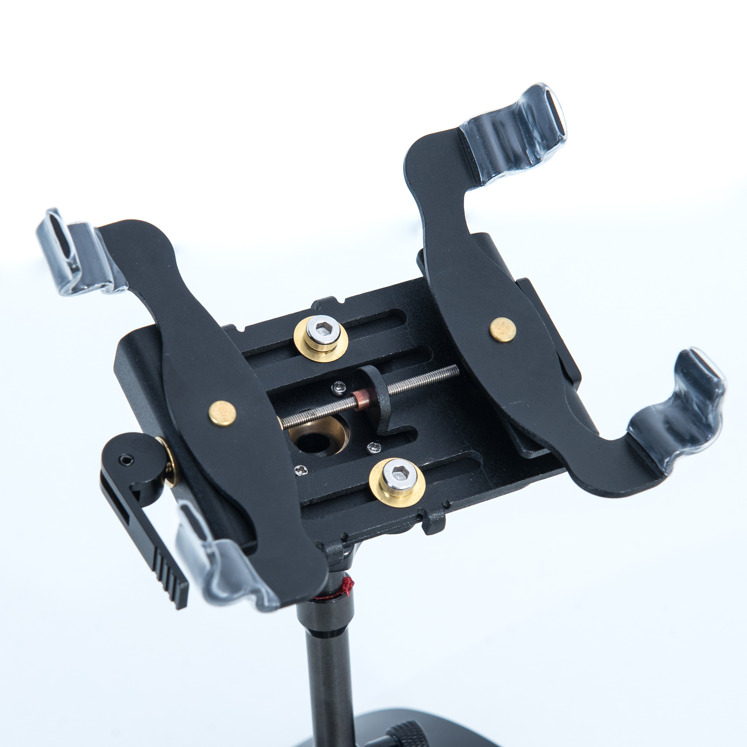 The Woodside GS4 guitar support utilizes a locking ball and socket mechanism to attach the support pillar to the clamping cradle.