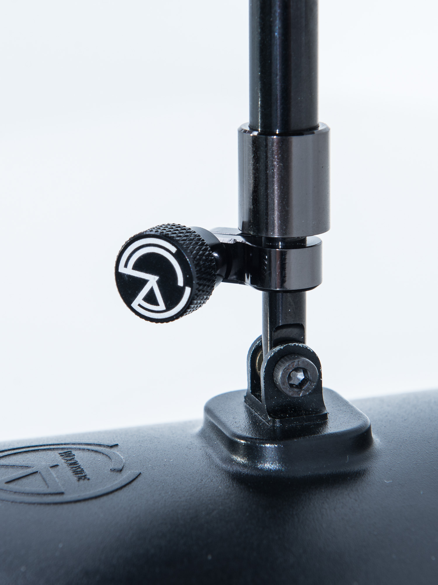 El soporte de guitarra Woodside GS4 utiliza un mecanismo de bola y casquillo de bloqueo para sujetar el pilar de soporte a la base de sujeción.