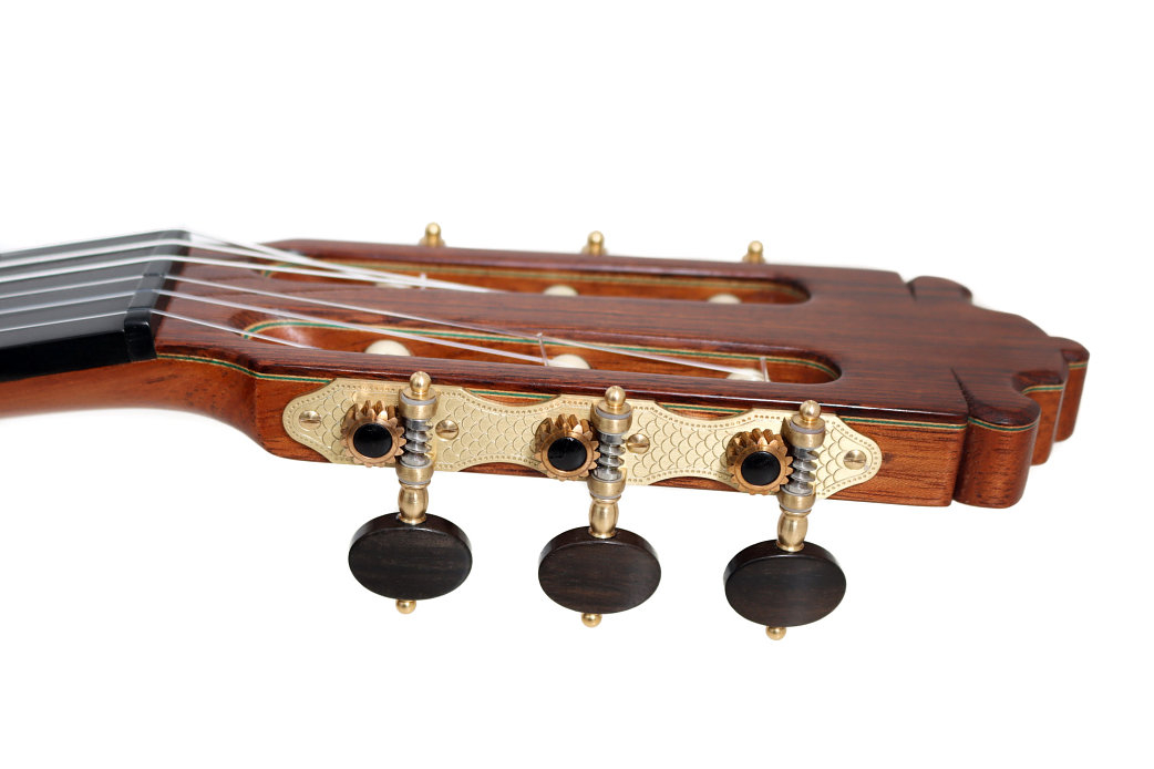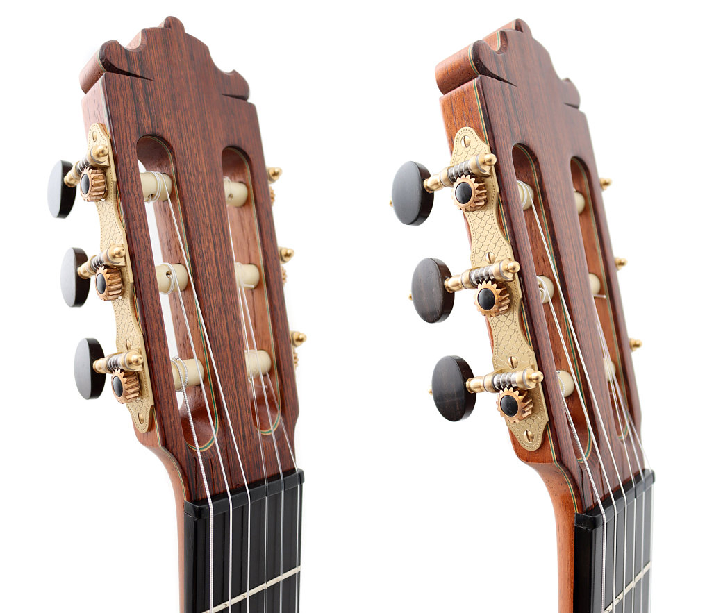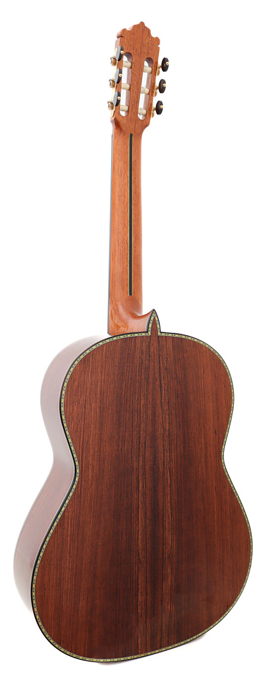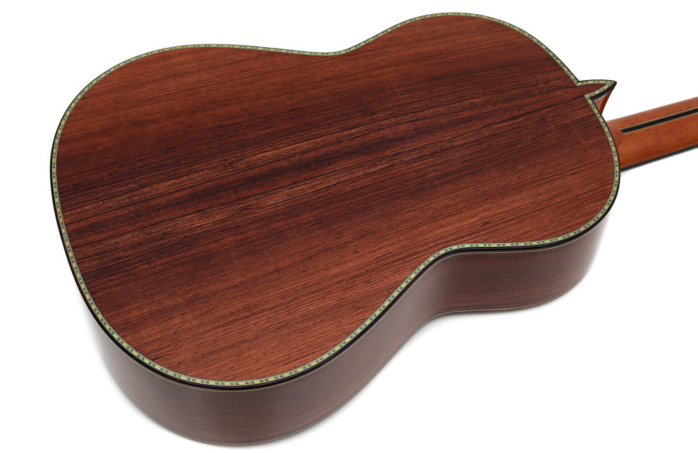 El palo rosa de Brasil, una de las maderas más apreciadas en la construcción de guitarras de concierto, añade una extraordinaria complejidad armónica y una proyección sobresaliente. Los graves se presentan profundos y bien definidos, los medios resultan redondos y expresivos, y los agudos destacan por su claridad y capacidad de sostener la línea melódica con elegancia. La combinación con la secuoya produce un equilibrio tonal excepcional, con una gran riqueza tímbrica y un sustain prolongado.